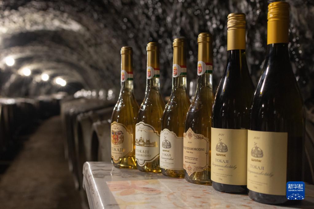 这是5月11日在匈牙利托卡伊鲍比茨酒庄的酒窖内拍摄的葡萄酒。