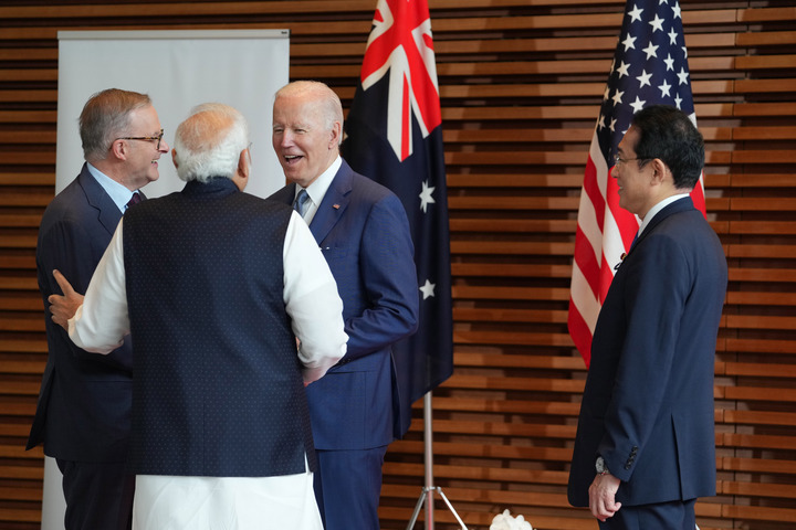 2022年5月24日,在日本东京,澳大利亚总理阿尔巴尼斯、印度总理莫迪、美国总统拜登和日本首相岸田文雄(从左到右)在美日印澳“四边机制”峰会的欢迎仪式上交流。新华社记者张笑宇摄