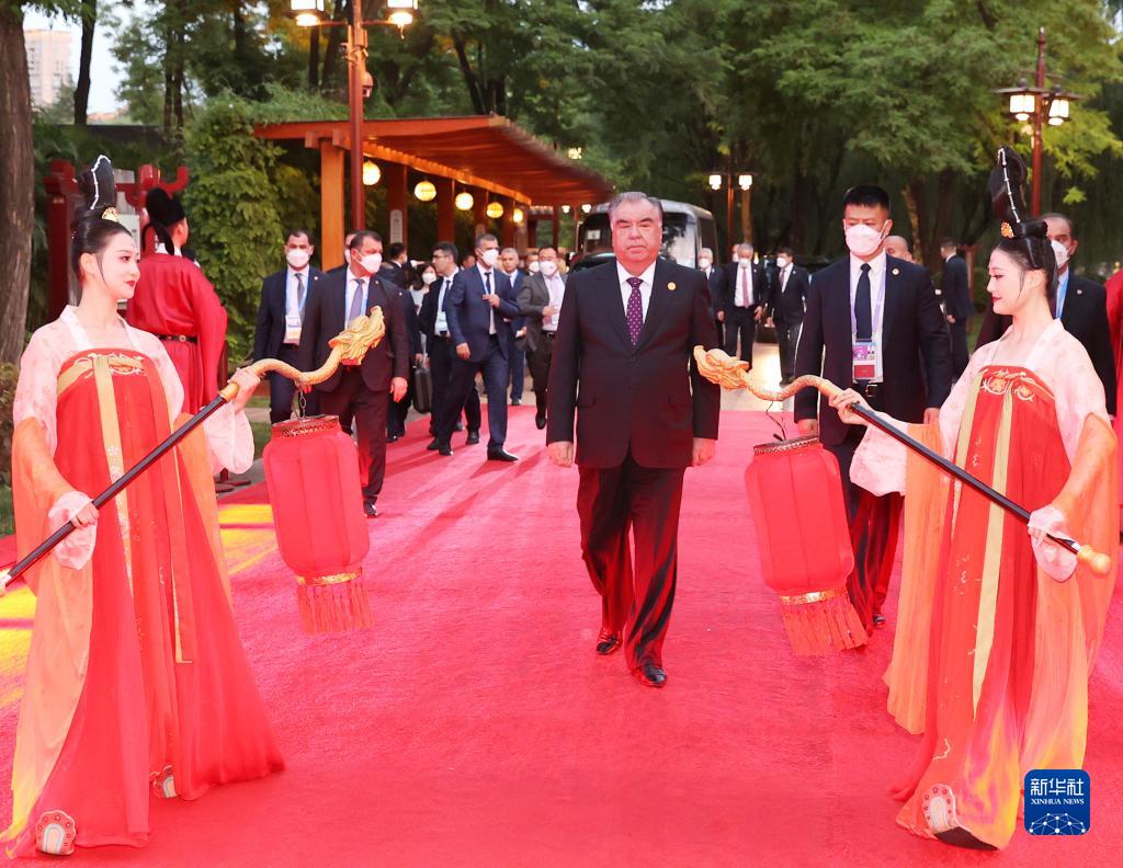 5月18日晚,出席中国-中亚峰会的中亚国家元首夫妇陆续抵达陕西省西安市大唐芙蓉园,参加在这里举行的欢迎仪式。这是塔吉克斯坦总统拉赫蒙抵达。新华社记者 徐子鉴 摄