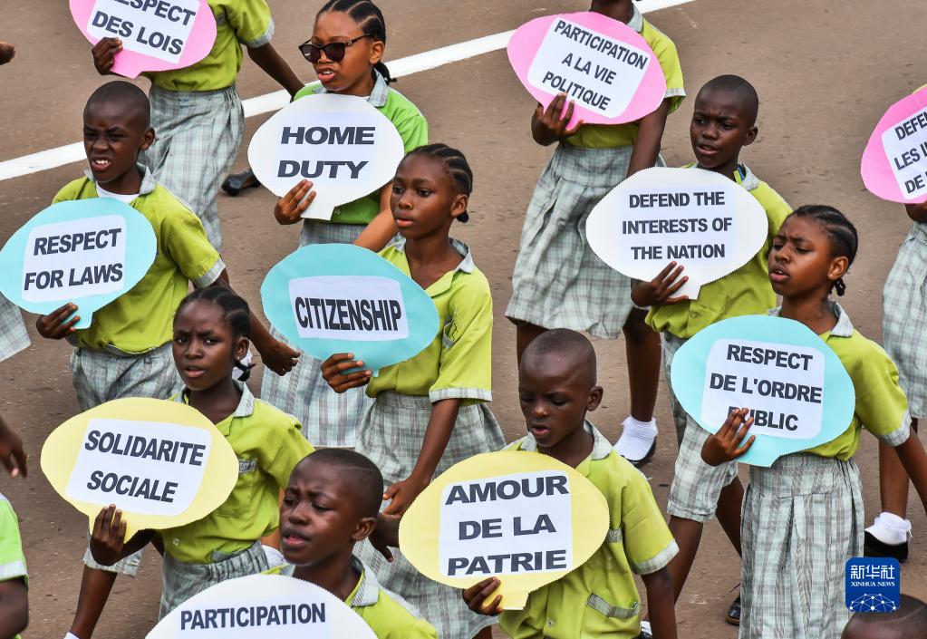5月20日,在喀麦隆首都雅温得举行的国庆庆祝活动上,少年儿童手举标语牌列队行进。