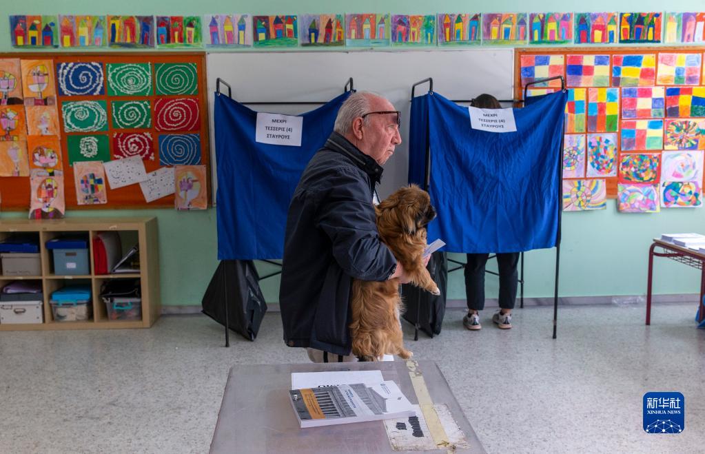 5月21日,一名选民抱着宠物犬在希腊雅典一处投票站参加投票。