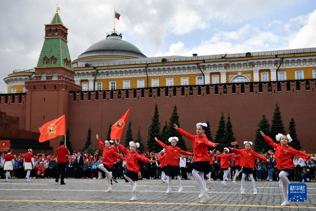 5月21日,在俄罗斯首都莫斯科,孩子们在少先队入队仪式上表演。