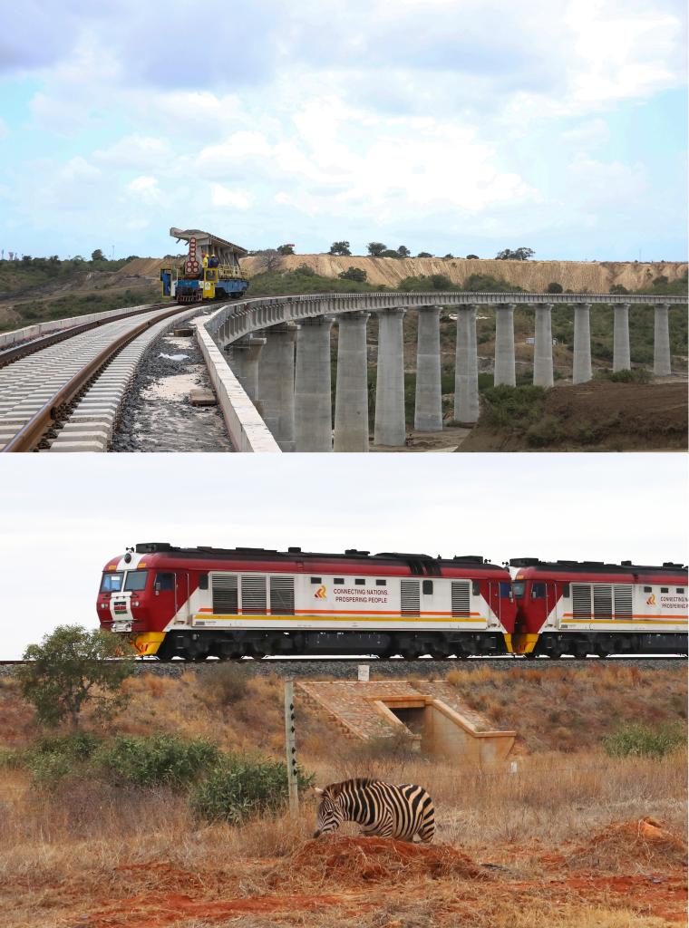 上图:这是2016年9月1日在肯尼亚蒙巴萨拍摄的建设中的蒙内铁路蒙巴萨特大桥项目。新华社记者 潘思危 摄