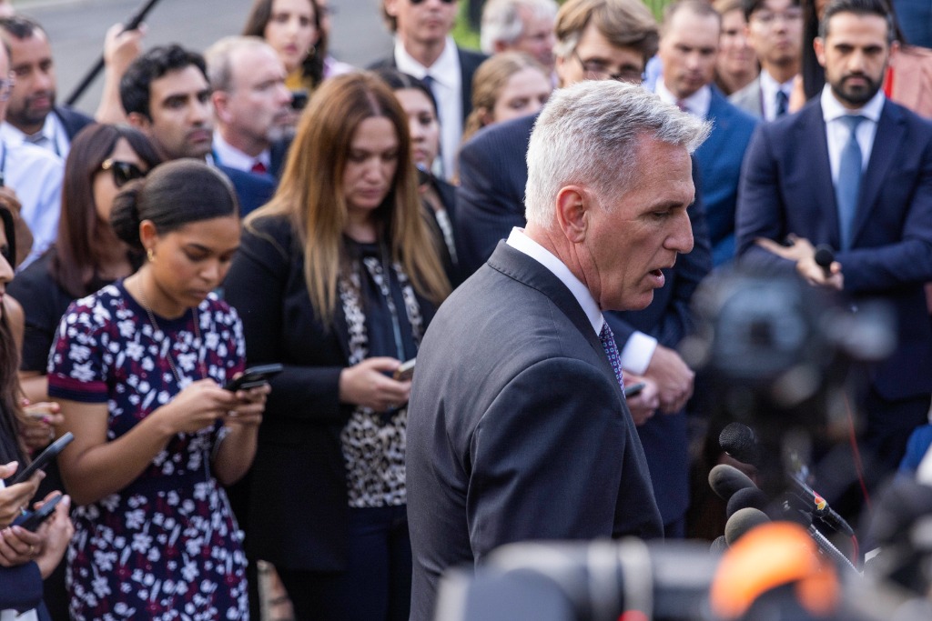 5月22日,在美国华盛顿白宫,国会众议长、共和党人凯文·麦卡锡就债务上限问题与美国总统拜登谈判后回答记者提问。新华社发(亚伦摄)