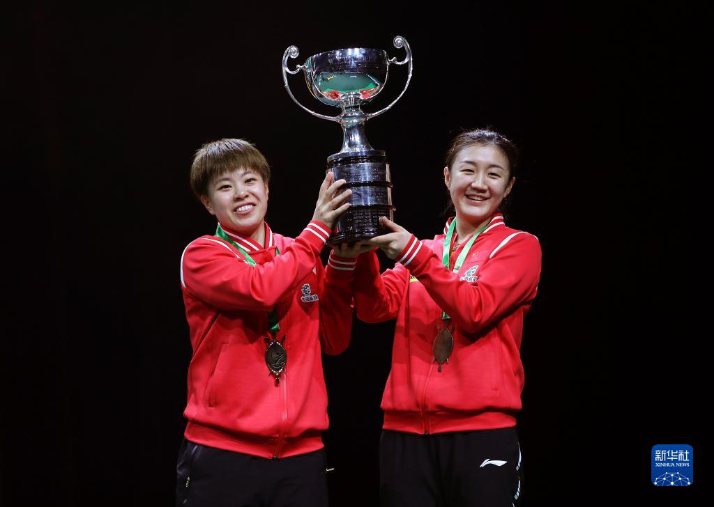 5月27日,冠军中国组合陈梦/王艺迪(左)在颁奖仪式上捧起奖杯。