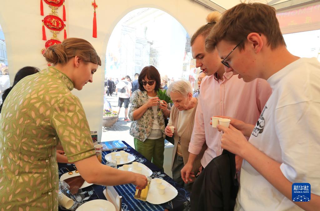 5月27日,人们在白俄罗斯首都明斯克体验白族三道茶。新华社发(任科夫摄)