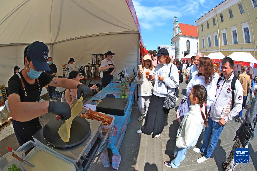 5月27日,人们在白俄罗斯首都明斯克的“茶和天下·雅集”活动上排队购买煎饼。新华社发(任科夫摄)