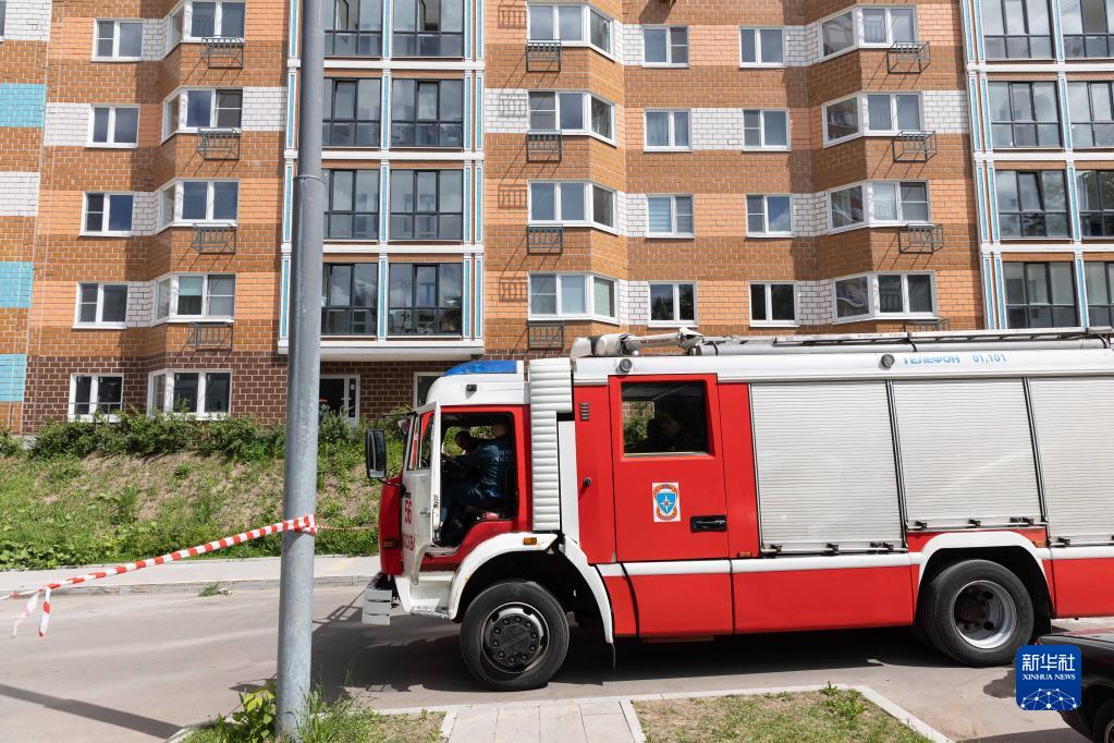 5月30日,消防员在俄罗斯首都莫斯科的楼房遭袭现场工作。