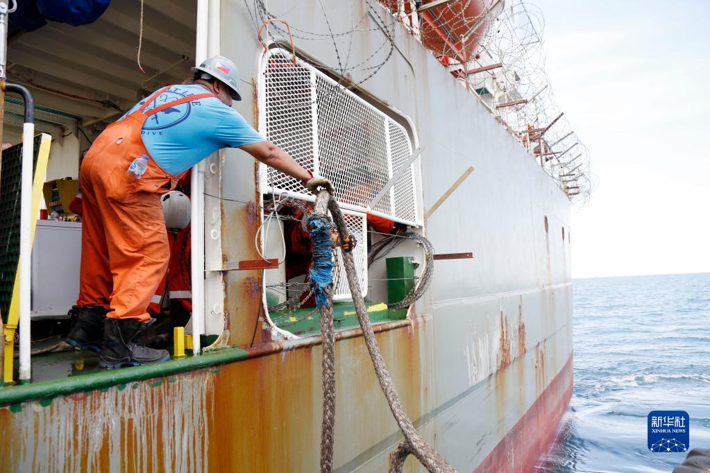 5月30日,联合国工程船的船员在该船抵达也门红海港口荷台达附近海域后固定船只。