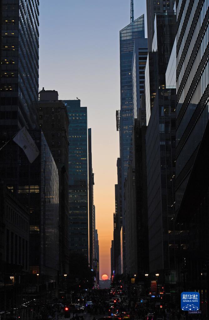 当日,纽约出现“曼哈顿悬日”景观。“曼哈顿悬日”是纽约市标志性景观,每年5月和7月出现两次,指日落时太阳正好出现在曼哈顿东西向街道正上方、似乎悬在两侧高楼大厦之间的戏剧性画面。