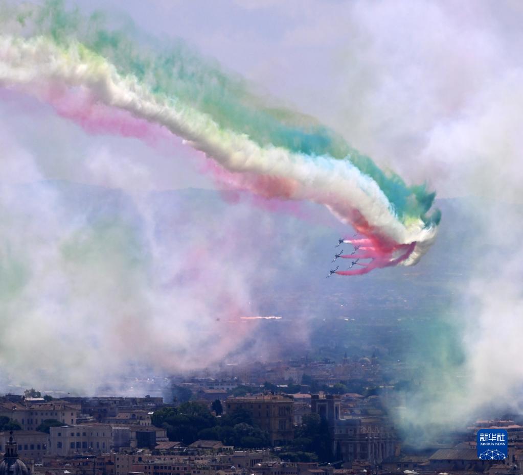 6月2日,意大利“三色箭”特技飞行表演队在罗马参加共和国日庆祝仪式。
