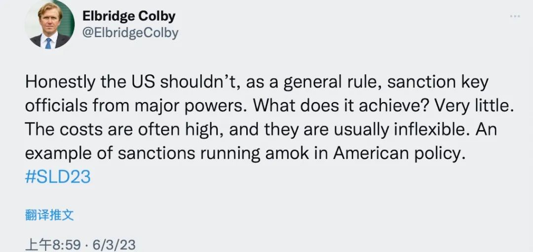 美方对李尚福制裁的行为在美国国内也遭到一些非议。甚至连特朗普政府时期的副助理防长、共和党对华强硬派代表埃尔布里奇·科尔比对此都坦言: