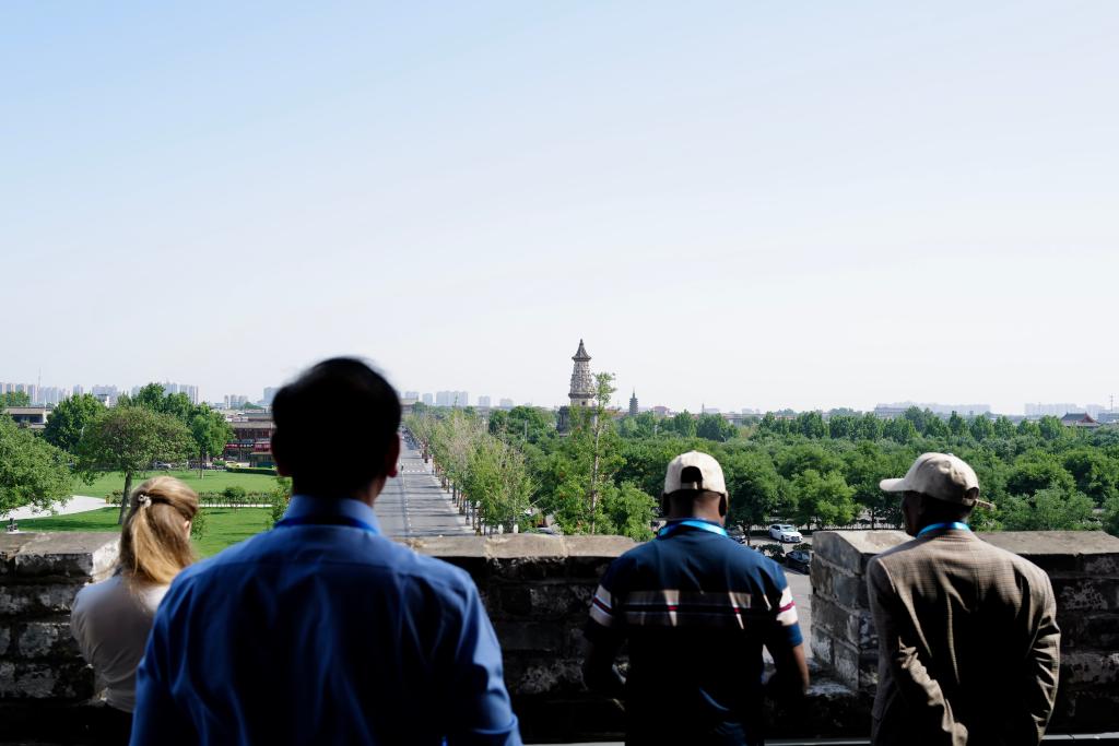 使节们在正定南城门城楼上眺望广惠寺华塔。新华社记者 邵艺博 摄