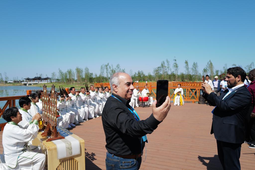 使节们在雄安新区白洋淀欣赏雄安古乐。新华社记者 邵艺博 摄