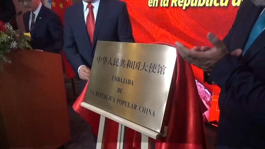 仪式现场先后奏响中洪两国国歌。随后中国驻洪都拉斯使馆临时代办于波与洪外交部长雷纳共同为使馆揭牌。