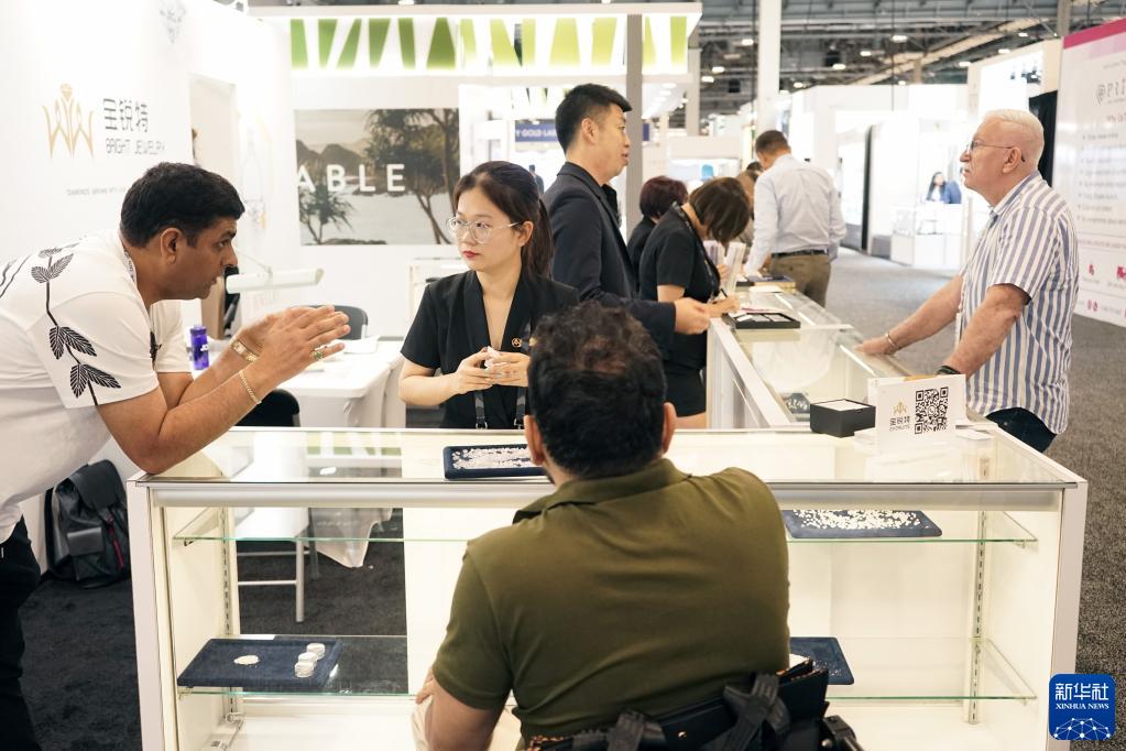 6月2日,在美国拉斯维加斯珠宝展上,珠宝业内人士参观中国公司宝锐特的展区。