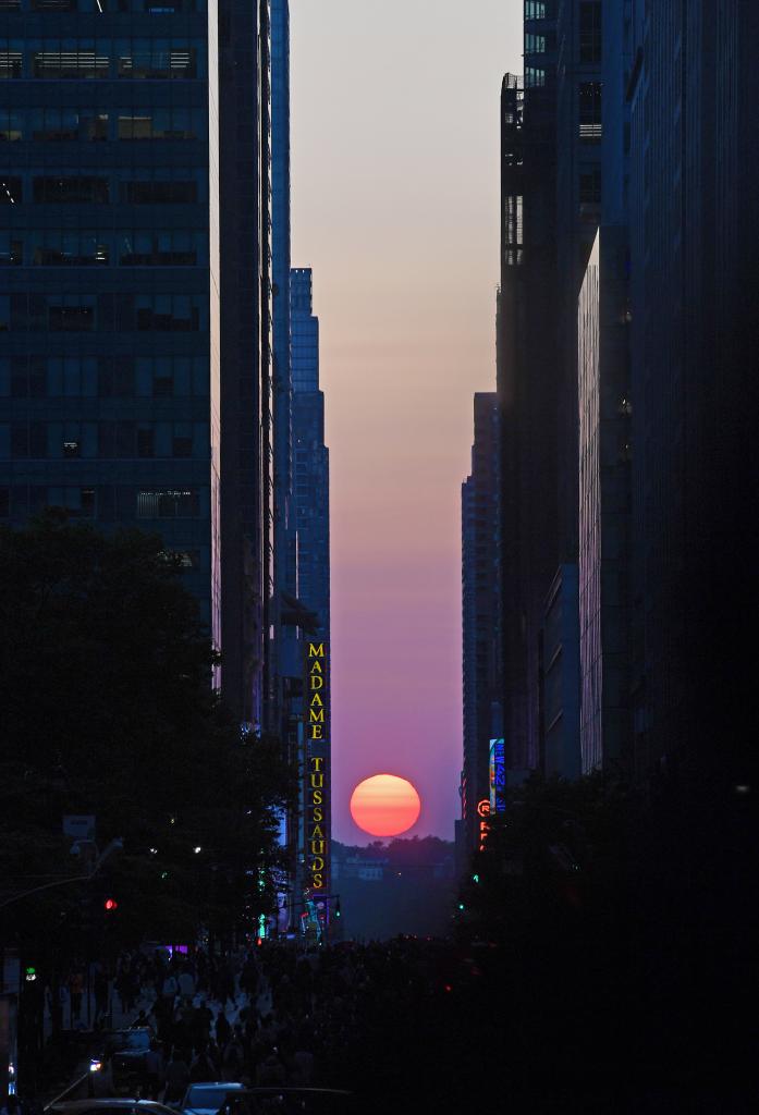 这是5月30日在美国纽约拍摄的“曼哈顿悬日”。当日,纽约出现“曼哈顿悬日”景观。新华社记者李睿摄