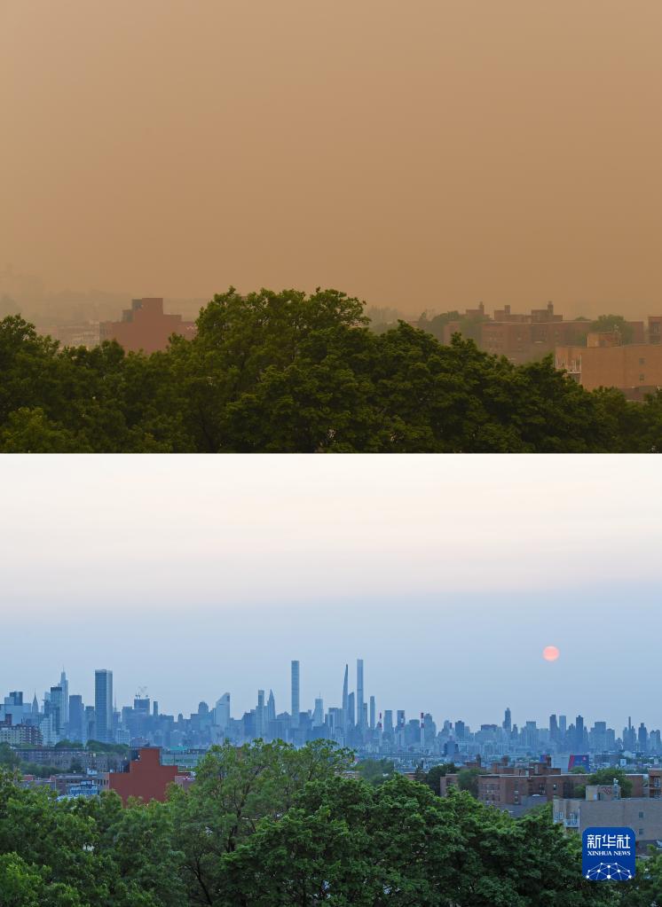 这张拼版照片显示的是烟尘笼罩下的美国纽约(上图,6月7日摄)和受烟尘影响前的纽约(下图,5月21日摄)。