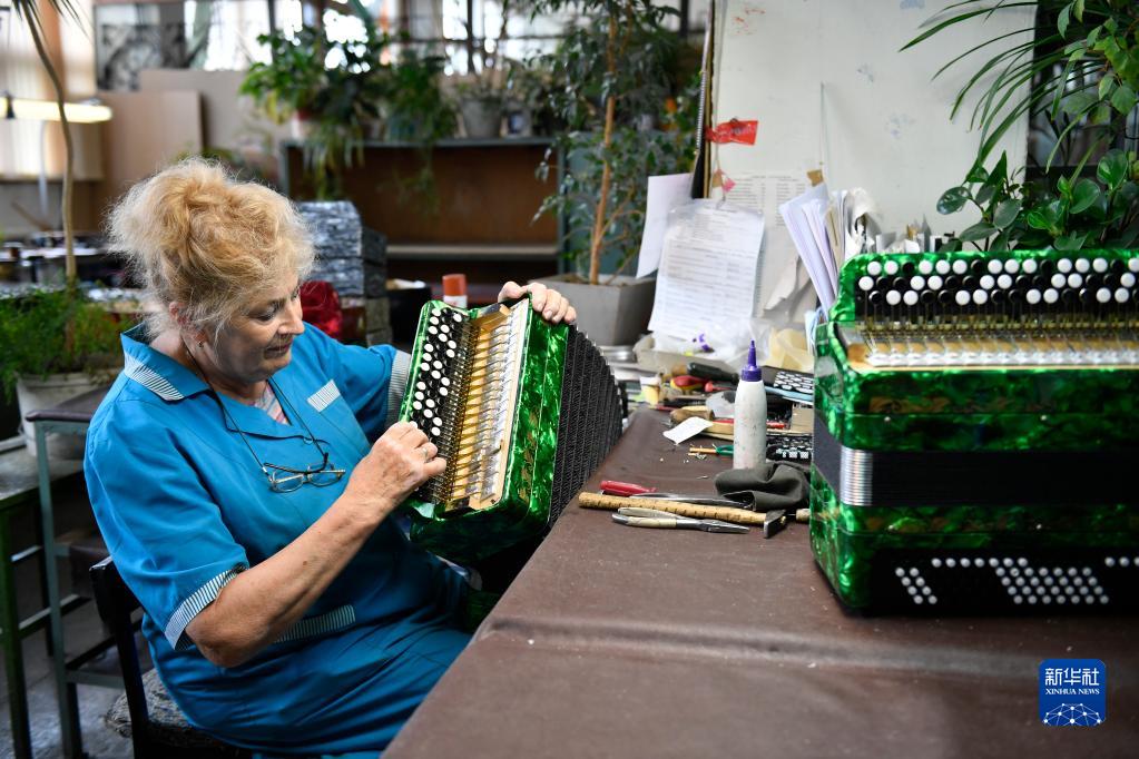 6月7日,在俄罗斯图拉,工作人员为即将出厂的巴扬手风琴试音。
