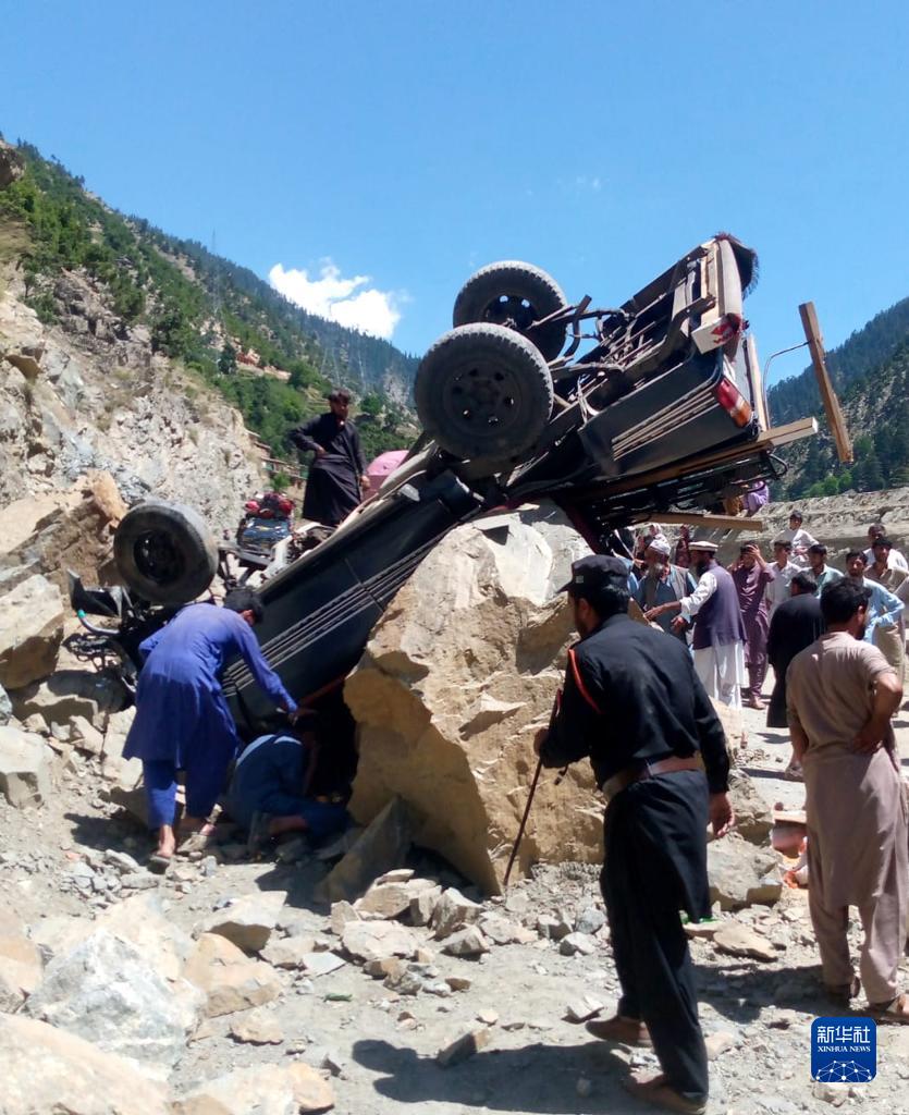 6月8日,在巴基斯坦开伯尔-普什图省的上迪尔地区,人们聚集在坠入峡谷的车辆周围。