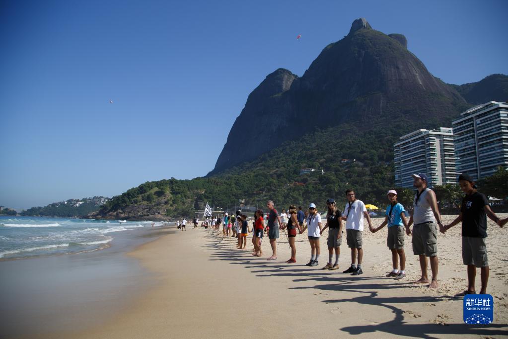 6月8日,在巴西里约热内卢圣孔拉杜海滩,志愿者手拉手“拥抱”海洋。