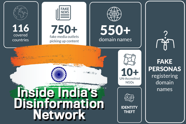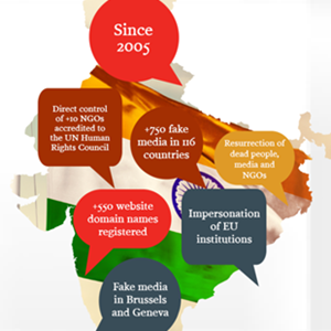 2020年12月,欧洲独立智库“欧盟虚假信息实验室”发布一份名为《印度纪事》的调查报告,揭露印度某些势力从2005年起针对与印度存在冲突的国家(主要为巴基斯坦和中国)实施持久、隐蔽和系统的信息战。