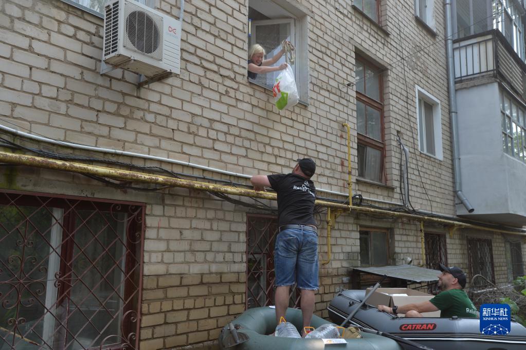 6月9日,志愿者向被洪水围困的赫尔松市民运送生活物资。位于赫尔松州的卡霍夫卡水电站6日遭破坏导致水库大坝决堤,第聂伯河下游水位大幅上涨,造成严重生态和人道主义风险。新华社发(彼得·德鲁克摄)