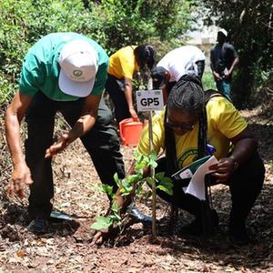 6月9日,志愿者在加纳首都阿克拉市区一片林地栽种树苗。