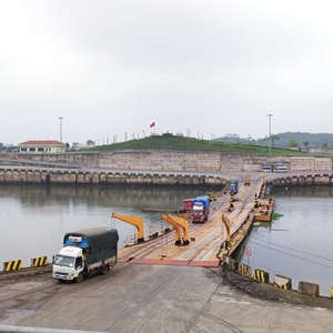 跨境货运车辆通过连通中越两国的北仑河互市浮桥(4月12日摄)。新华社记者 朱丽莉 摄