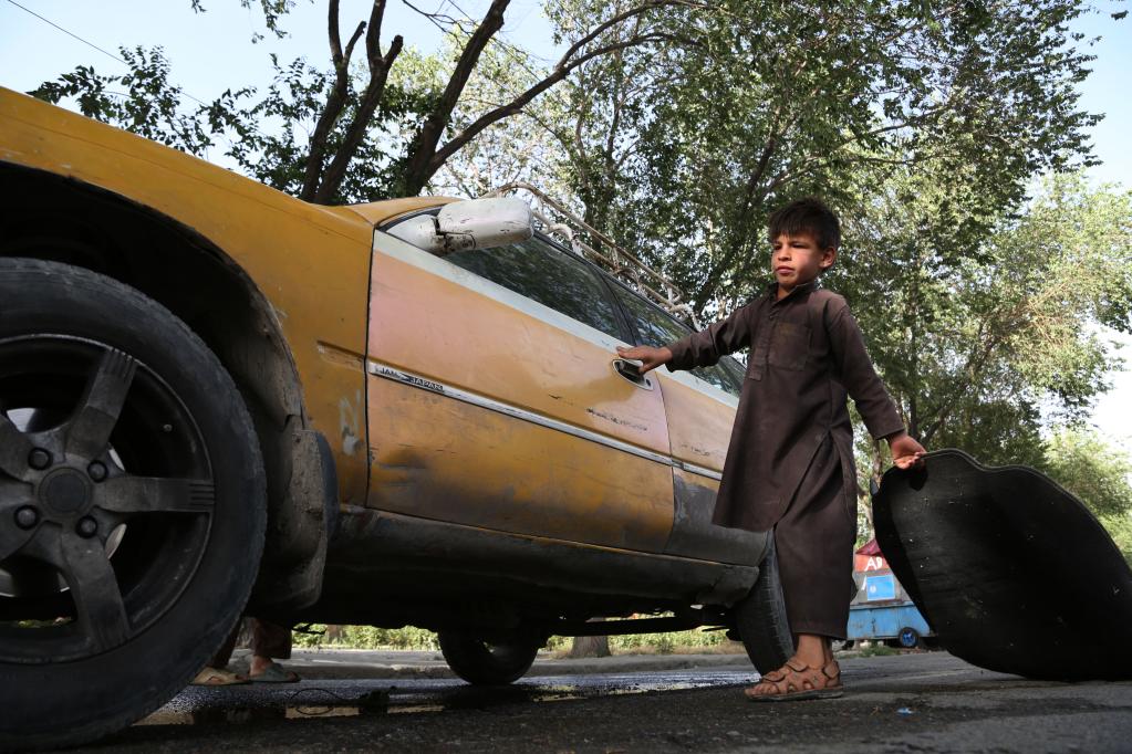 2021年6月11日,一名童工在阿富汗首都喀布尔街头洗车。新华社发(拉赫马图拉·阿里扎达摄)