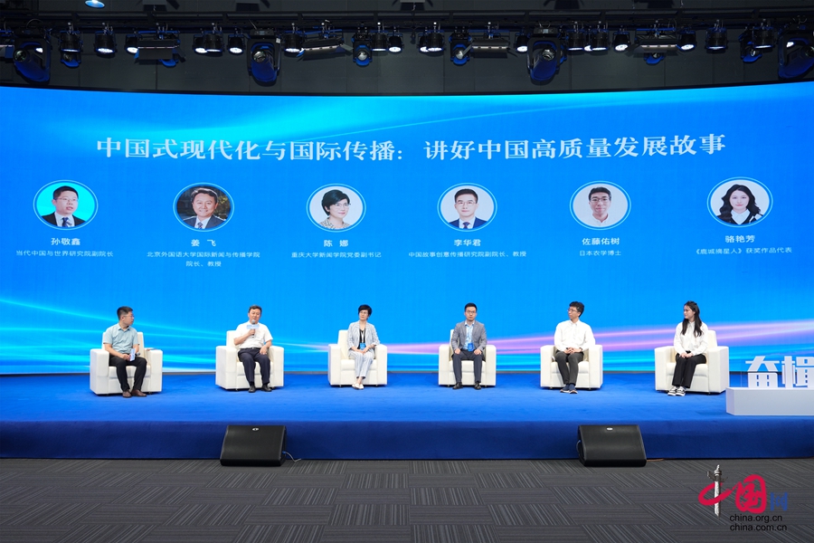 圆桌讨论环节,在当代中国与世界研究院副院长孙敬鑫的主持下,北京外国语大学国际新闻与传播学院院长、教授姜飞,重庆大学新闻学院党委副书记陈娜,中国故事创意传播研究院副院长、教授李华君,日本农学博士佐藤佑树,《鹿城摘星人》获奖作品代表骆艳芳围绕“中国式现代化与国际传播:讲好中国高质量发展故事”这一主题,分别从高质量发展、中国式现代化、国际传播等方面分享了各自观点。