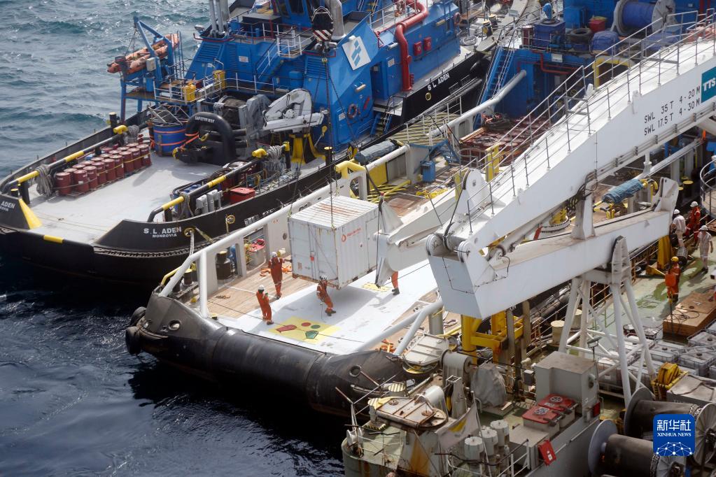 这是6月12日在也门荷台达附近海域拍摄的联合国工程船。新华社发(穆罕默德·穆罕默德摄)