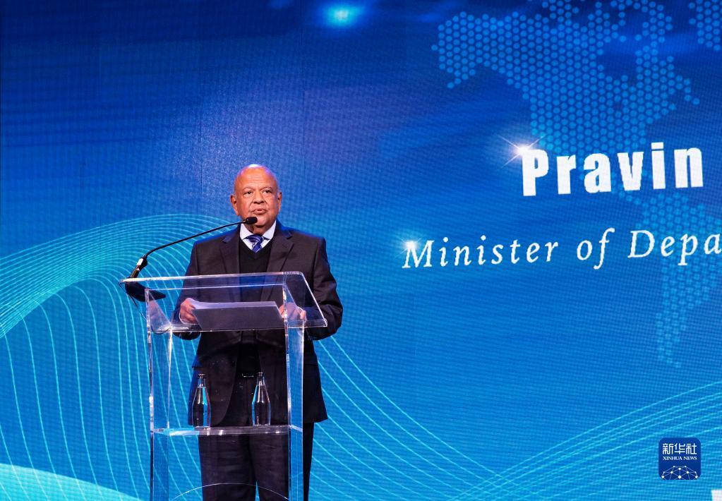 6月13日,在南非约翰内斯堡,南非国有企业部长普拉温·戈尔丹在中国-南非新能源投资合作大会上致辞。新华社记者 张誉东 摄