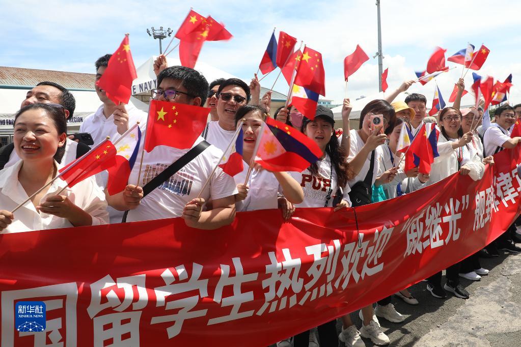 6月14日,在菲律宾马尼拉港,人们热烈欢迎来访的中国海军戚继光舰。新华社发