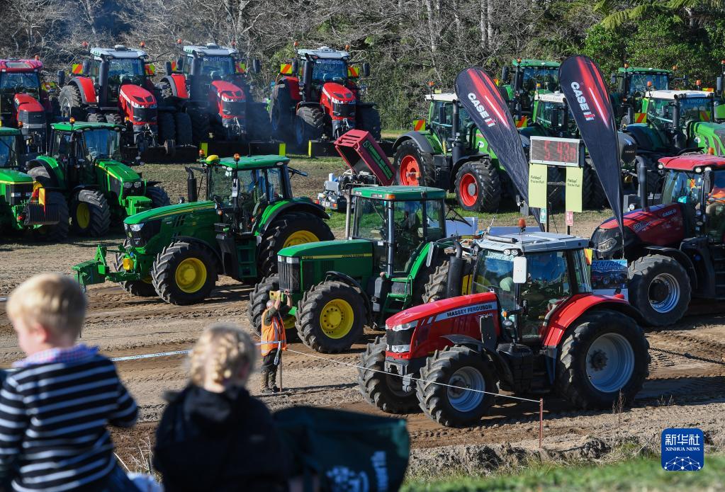 6月14日,在新西兰汉密尔顿举行的国际农业博览会上,人们观看拖拉机牵引大赛。新华社记者 郭磊 摄