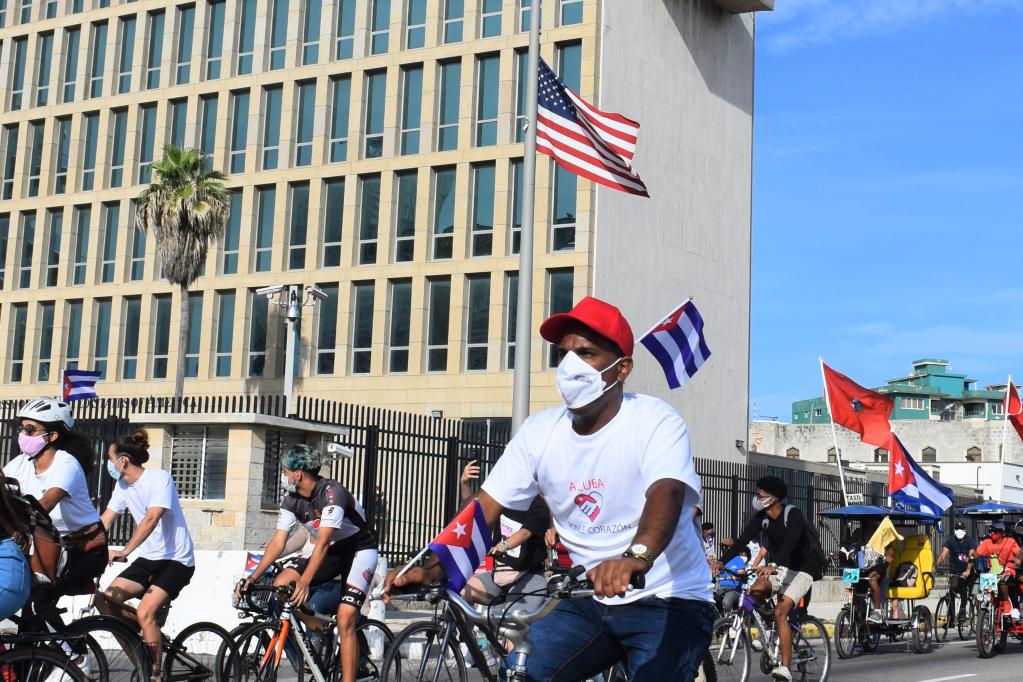 2021年8月5日,在古巴首都哈瓦那,反美封锁游行队伍经过美国驻古巴大使馆。新华社记者朱婉君摄