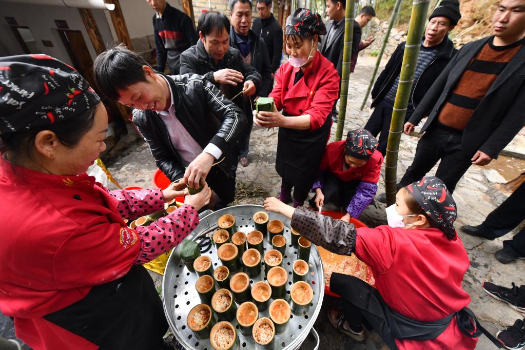 2月18日,在广西融安县东起乡铜板屯,桂黔乌英苗寨村民学习制作竹筒饭。新华社记者 黄孝邦 摄