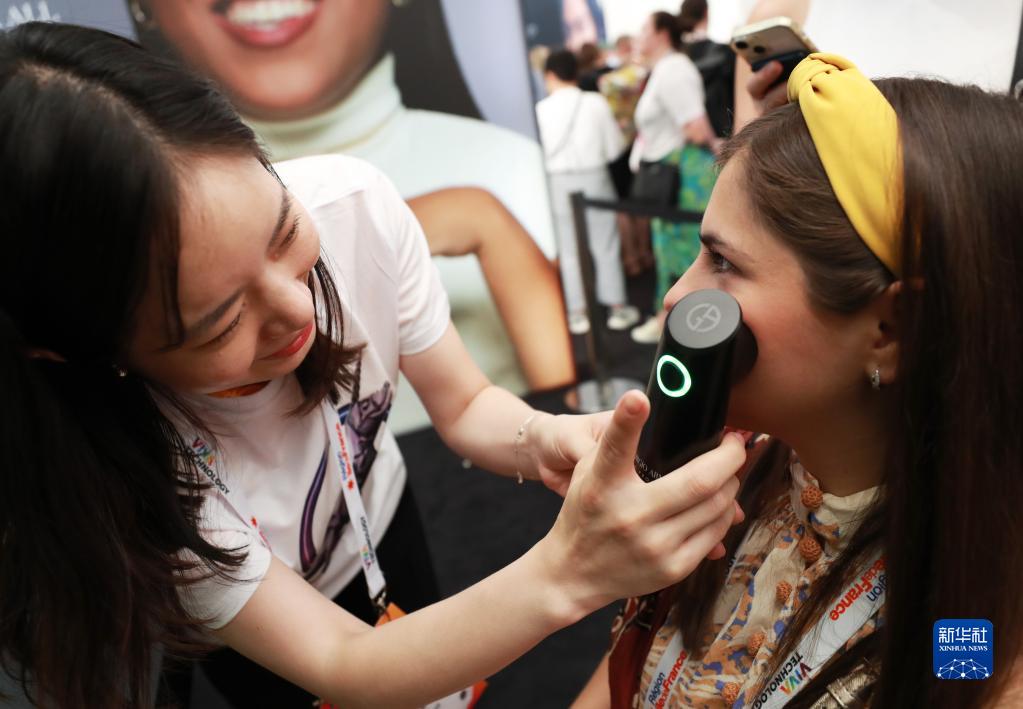 6月15日,在法国巴黎凡尔赛门展览中心,人们在“科技万岁”科技创新展的欧莱雅展台体验肌肤检测。