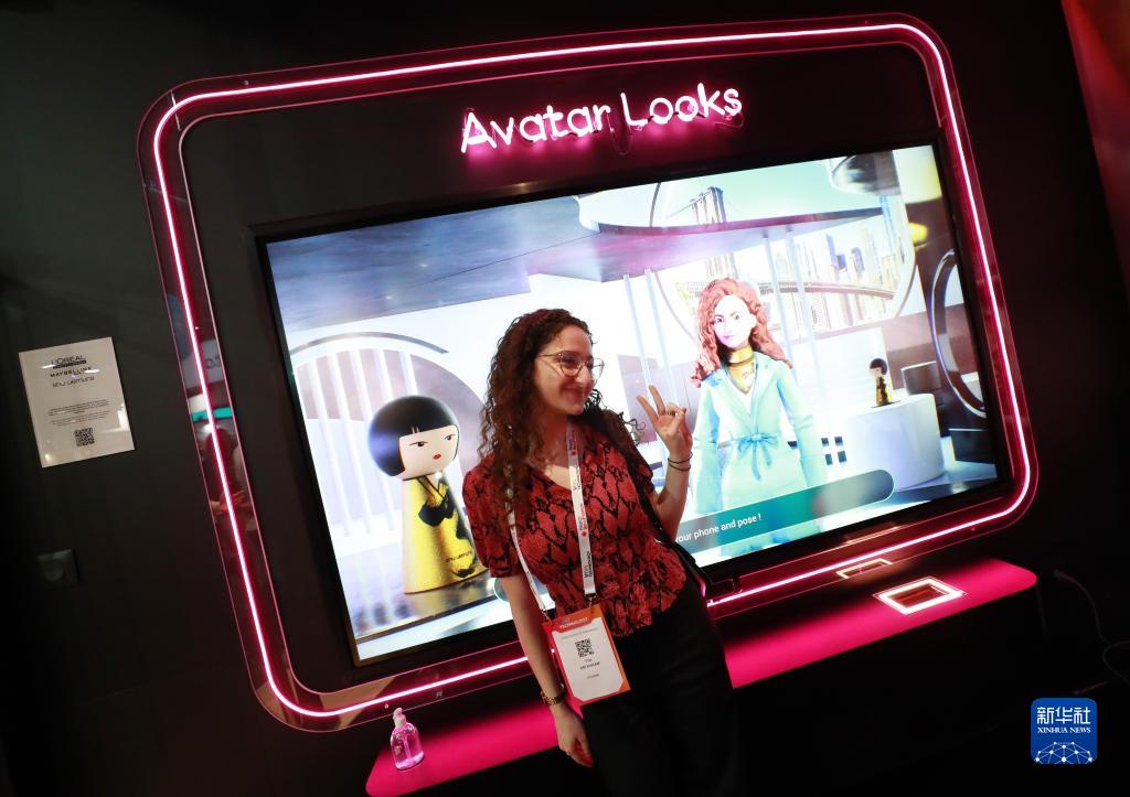 6月15日,在法国巴黎凡尔赛门展览中心,一名女子在“科技万岁”科技创新展的欧莱雅展台参观体验。