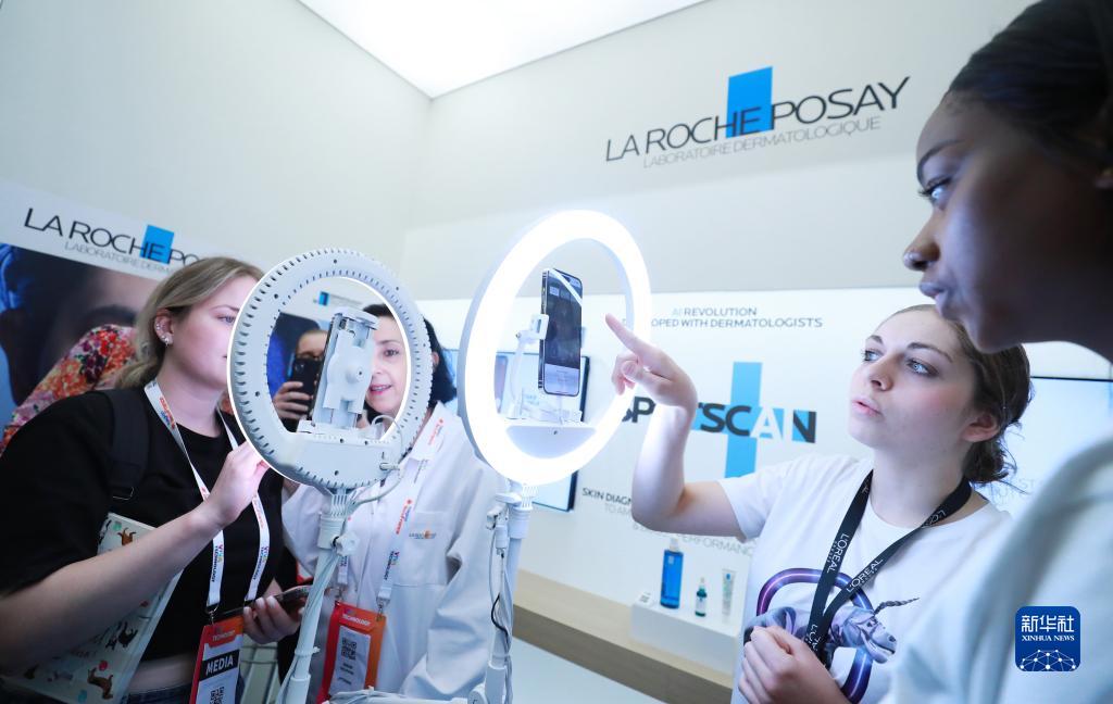 6月15日,在法国巴黎凡尔赛门展览中心,人们在“科技万岁”科技创新展上的欧莱雅展台体验皮肤检测。
