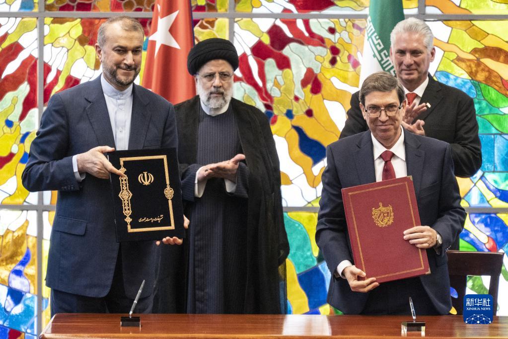 6月15日,在古巴首都哈瓦那革命宫,在古巴国家主席迪亚斯-卡内尔(后右)和伊朗总统莱希(后左)的见证下,古巴外交部长布鲁诺·罗德里格斯(前右)和伊朗外交部长阿卜杜拉希扬(前左)签署双边合作协议。