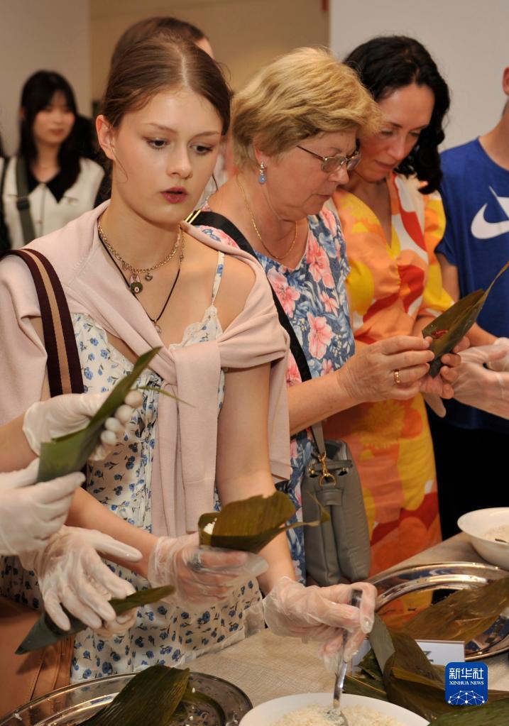 6月15日,人们在拉脱维亚里加举行的“茶和天下·端午雅集”活动上学包粽子。