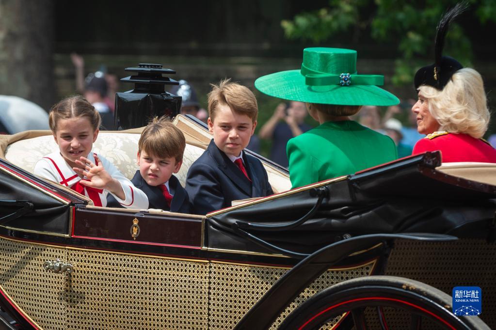 6月17日,在英国伦敦,乔治王子(左三)、路易王子(左二)、夏洛特公主(左一)乘坐马车参加阅兵式。