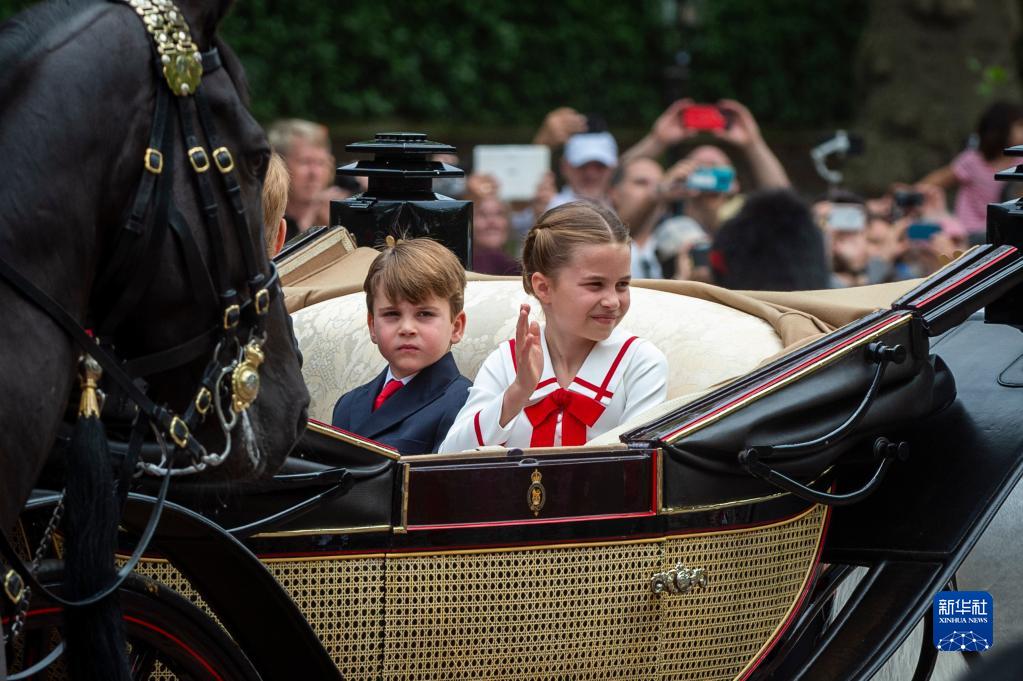 6月17日,在英国伦敦,夏洛特公主(右)与路易王子乘坐马车参加阅兵式。