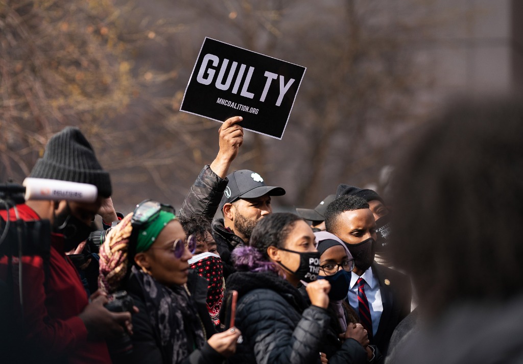 2021年4月20日,民众手举“有罪”的标语聚集在美国明尼阿波利斯市的法庭附近。当日,美国前白人警察德雷克·肖万被控杀害非洲裔男子乔治·弗洛伊德案在明尼苏达州明尼阿波利斯市宣判,肖万被控的谋杀和过失杀人等三项罪名全部成立。新华社发(本·布鲁尔摄)