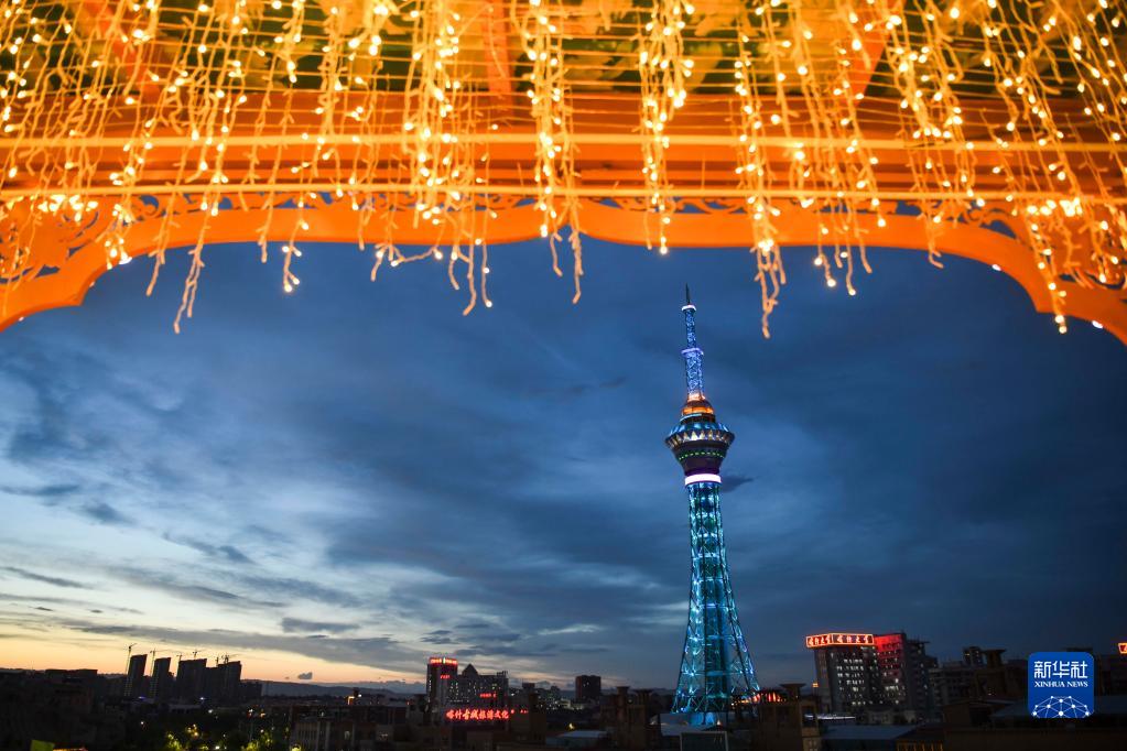 这是在新疆喀什古城景区城墙上拍摄的昆仑塔夜景(6月14日摄)。新华社记者 胡虎虎 摄