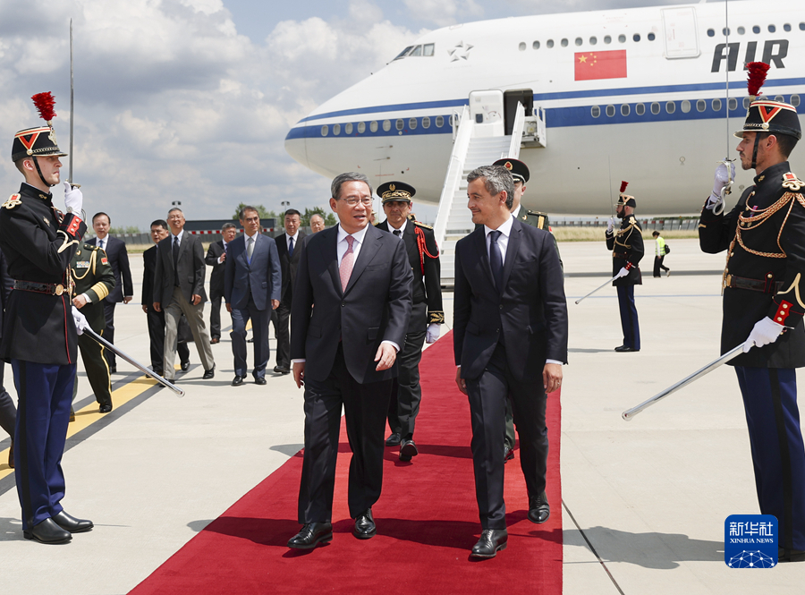 当地时间6月21日下午,应法国政府邀请,国务院总理李强乘包机抵达巴黎奥利机场,对法国进行正式访问并出席新全球融资契约峰会。礼兵沿红毯两侧列队致敬,法国内政部长达尔马宁等到机场迎接。新华社记者 丁海涛 摄