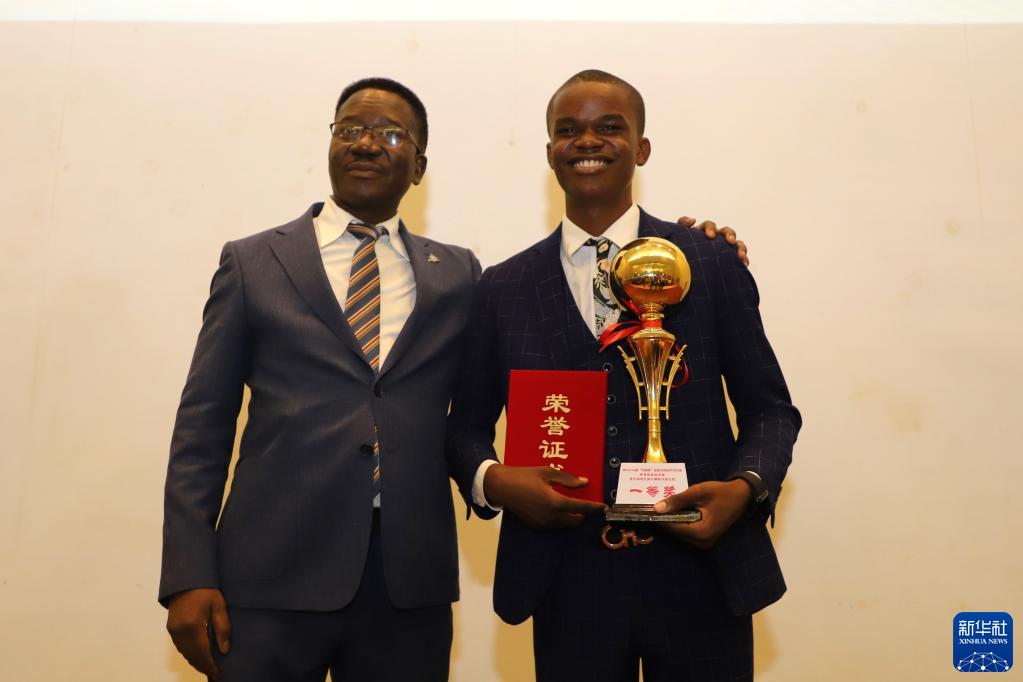 6月21日,在安哥拉首都罗安达,安哥拉内图大学校长佩德罗·马吉良斯(左)为获得一等奖的选手埃利亚金·布拉沃颁奖。新华社记者 吕诚成 摄