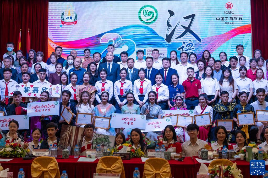 6月20日,在老挝万象,第22届“汉语桥”世界大学生中文比赛老挝赛区决赛参赛选手、组办者和嘉宾合影。新华社发(凯乔摄)