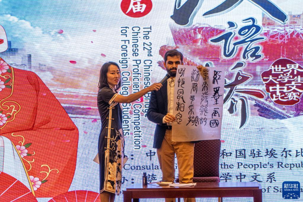 6月19日,在伊拉克埃尔比勒,选手在第22届“汉语桥”世界大学生中文比赛伊拉克库尔德地区(库区)决赛中展示才艺。新华社发(中国驻埃尔比勒总领馆供图)